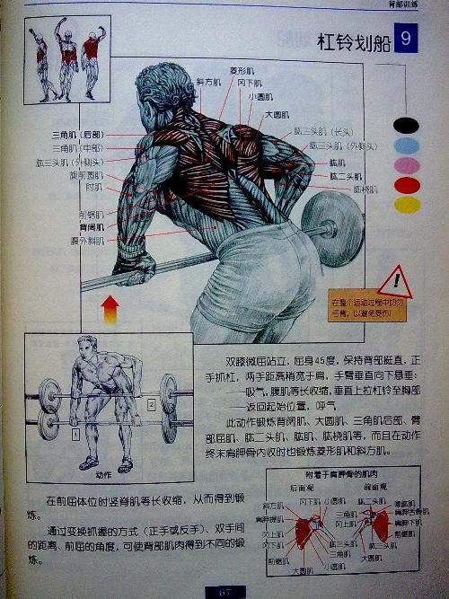 先講杠鈴劃船,杠鈴劃船如圖,雙手握距同肩寬,抓起杠鈴,俯身上身平行地麵,膝關節自然放鬆微曲,吸氣放下,呼氣拉起。