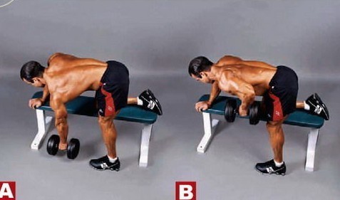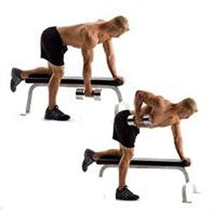 單手啞鈴劃船,可以使用平凳輔助,保持身體穩定,單膝跪在凳子上和一側手臂支撐,另一手持啞鈴,吸氣伸展放下充分拉伸背部,呼氣發力拉起啞鈴,手臂盡量貼住身體,將啞鈴拉至肋下。