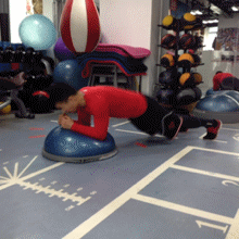 三個動作為一次循環,上肢,下肢,核心。 強度從低到高,逐步遞增,每組可做12-20次,間歇時間一分鍾。 (如無BOSU的可在地麵上完成)可提高肌耐力,心肺功能,肌肉爆發力。
